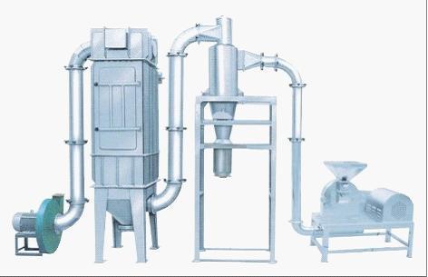工作原理:物料由料鬥經螺旋輸送器進入粉碎室,粉碎物經高速刀片剪切粉碎,通過負壓風運的方法把物料運入旋風分離器,袋式除塵器、排出物料達到產品的要求。